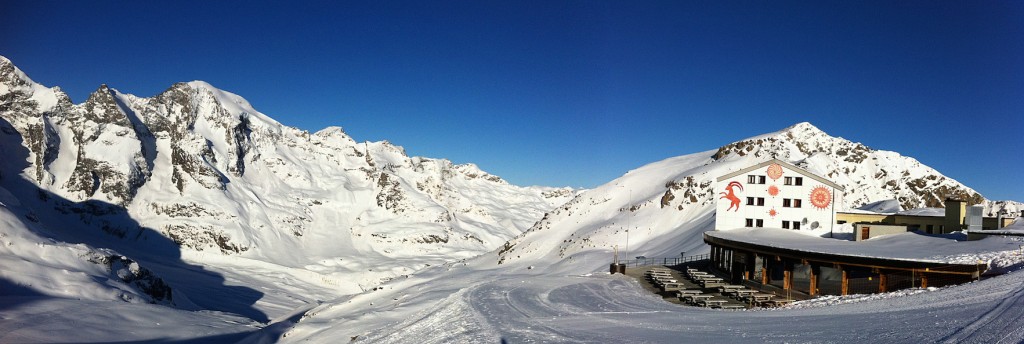 The Berghaus Diavolezza is a mountain hotel at 3000 m, an outpost of the St. Moritz ski area. It offers both simple and luxurious accommodations, and a breathtaking view of the Piz Palü, a 3901 m high mountain, which is often the destination of ski touring guests at the hotel. The main town of St. Moritz is reachable by the famous “Rhätische Bahn“, which has UNESCO World Heritage status for the track between Thusis and Tirano, with one stop located at the bottom of the Diavolezza cable car. St. Moritz is one of the most glamorous ski resorts in the Alps, with the Corvatsch mountain (3303 m) being the highest peak reachable by cable car in the area. A spectacular 10km glacier run guides the adventurous skier from the top of the Diavolezza to Morteratsch, where the train takes you either down to St. Moritz or up the valley towards the Bernina pass. The area is located on the Southern side of the Alps and this year it received enormous amounts of snow. Sahara sand was blown across the Mediterranean by strong winds and created colorful patches on slopes with southern exposure. A beautiful train ride back to Chur completed our four day stay at the top of the world.
